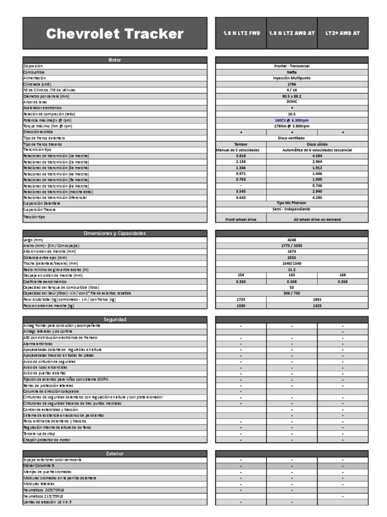 130 HP de potencia. COLORES Blanco Plomo CaféPlata Azul Celeste Vino Negro ESPECIFICACIONES TÉCNICAS MEDIDAS Alto mm Ancho mm Largo mm 1675. La nueva Chevrolet Tracker sorprende no solo por su diseño tecnología y seguridad además trae un motor 18 litros que ostenta 178 Nm de torque.